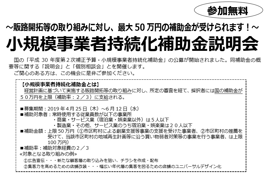 小規模事業者持続化補助金説明会 ~販路開拓等の取り組みに対し、最大50万円の補助金が受けられます!~